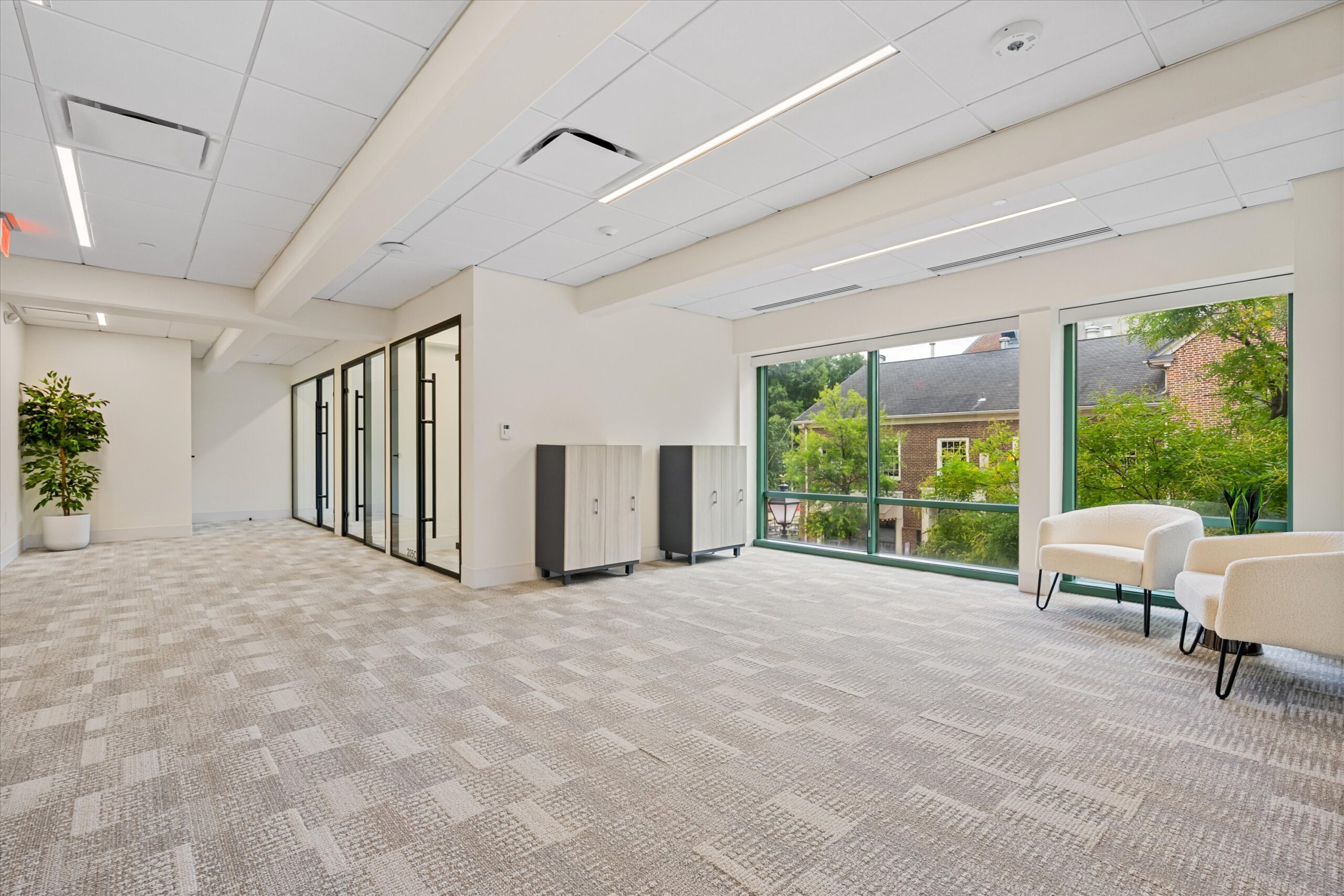 Located in a corner position away from main building traffic, this suite delivers quiet workspace. Nine workstations provide a foundation for focused work, while two windowed internal rooms offer flexibility for offices or meetings. Corner windows bring in natural light from multiple angles.