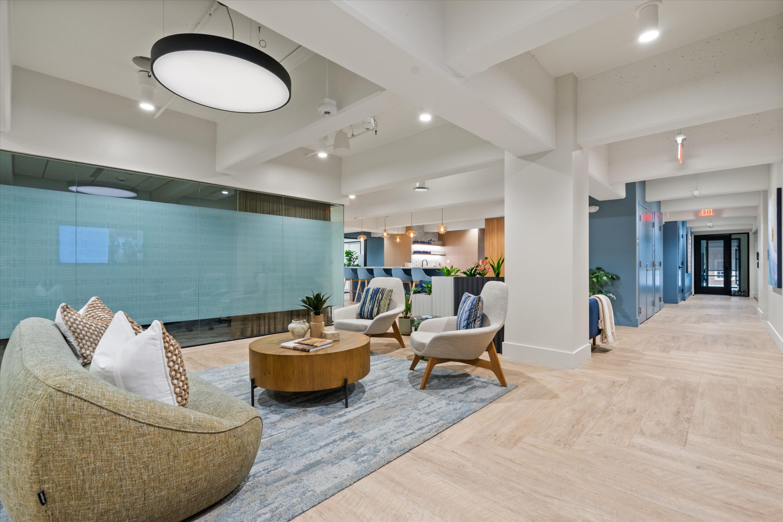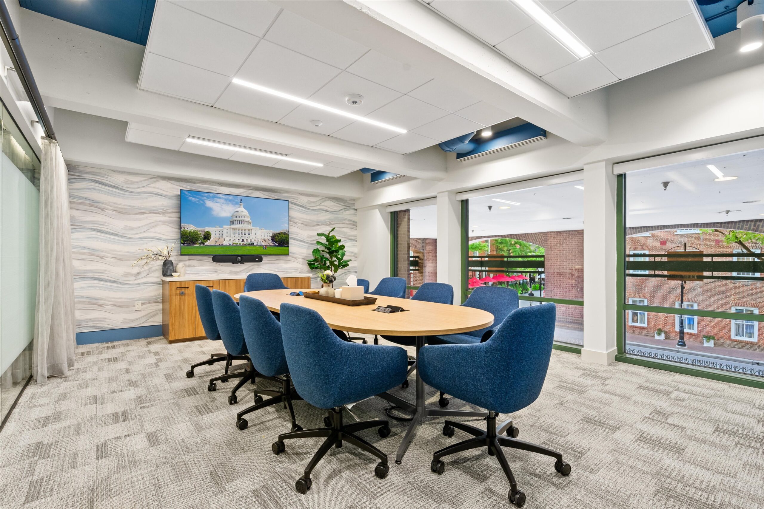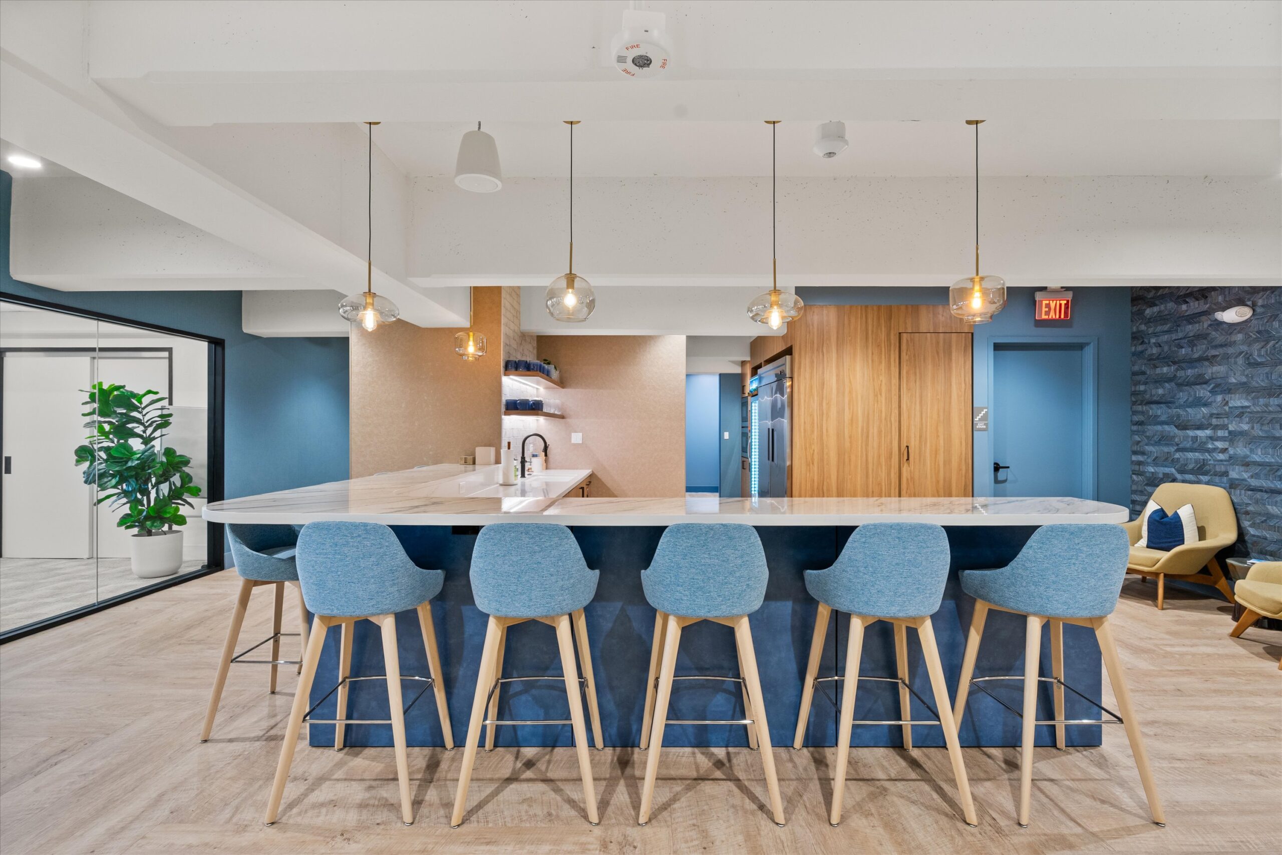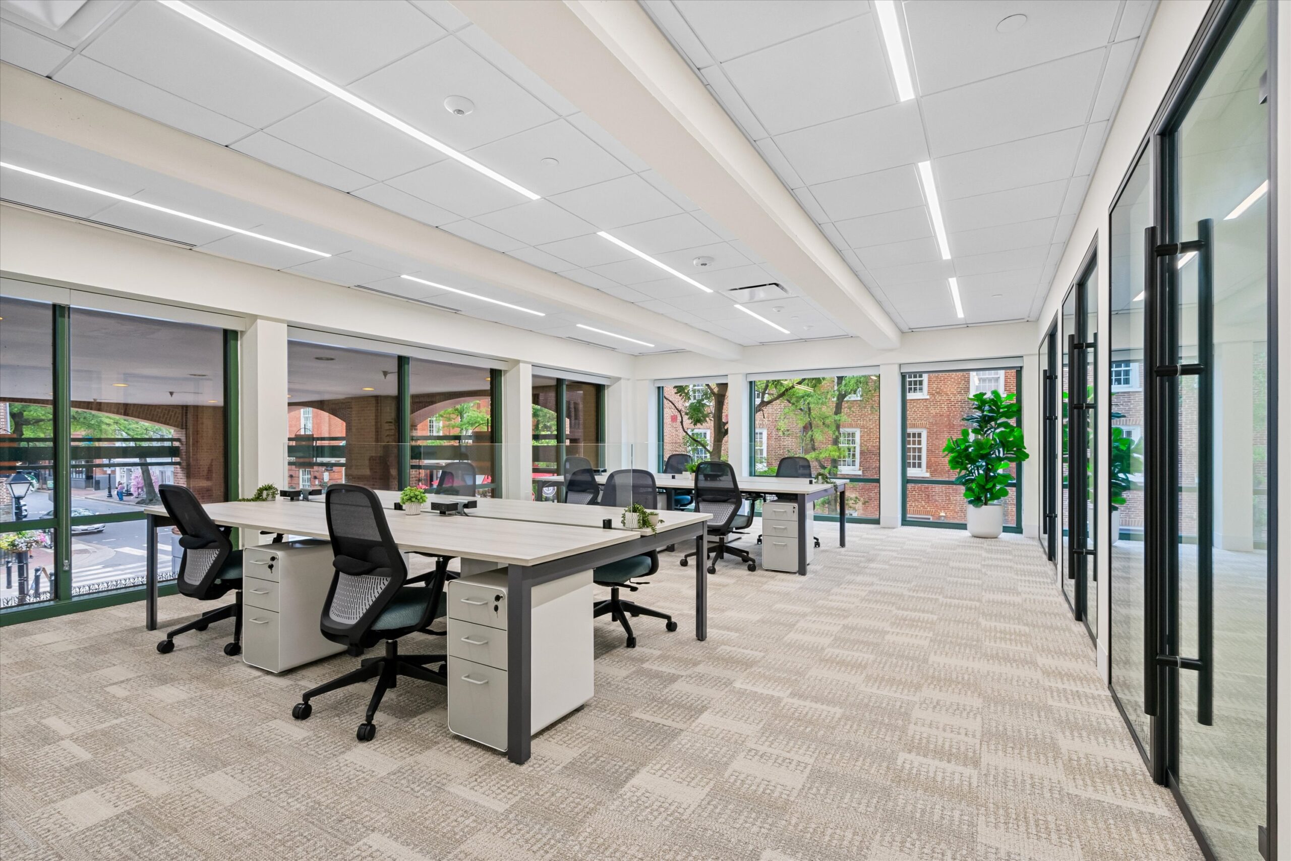 Positioned in a corner away from main traffic areas, this suite offers workspace with added privacy. Eleven workstations provide room to accommodate your team, while three internal offices adapt as meeting areas or individual offices based on your needs. Corner windows bring in natural light throughout the space.
