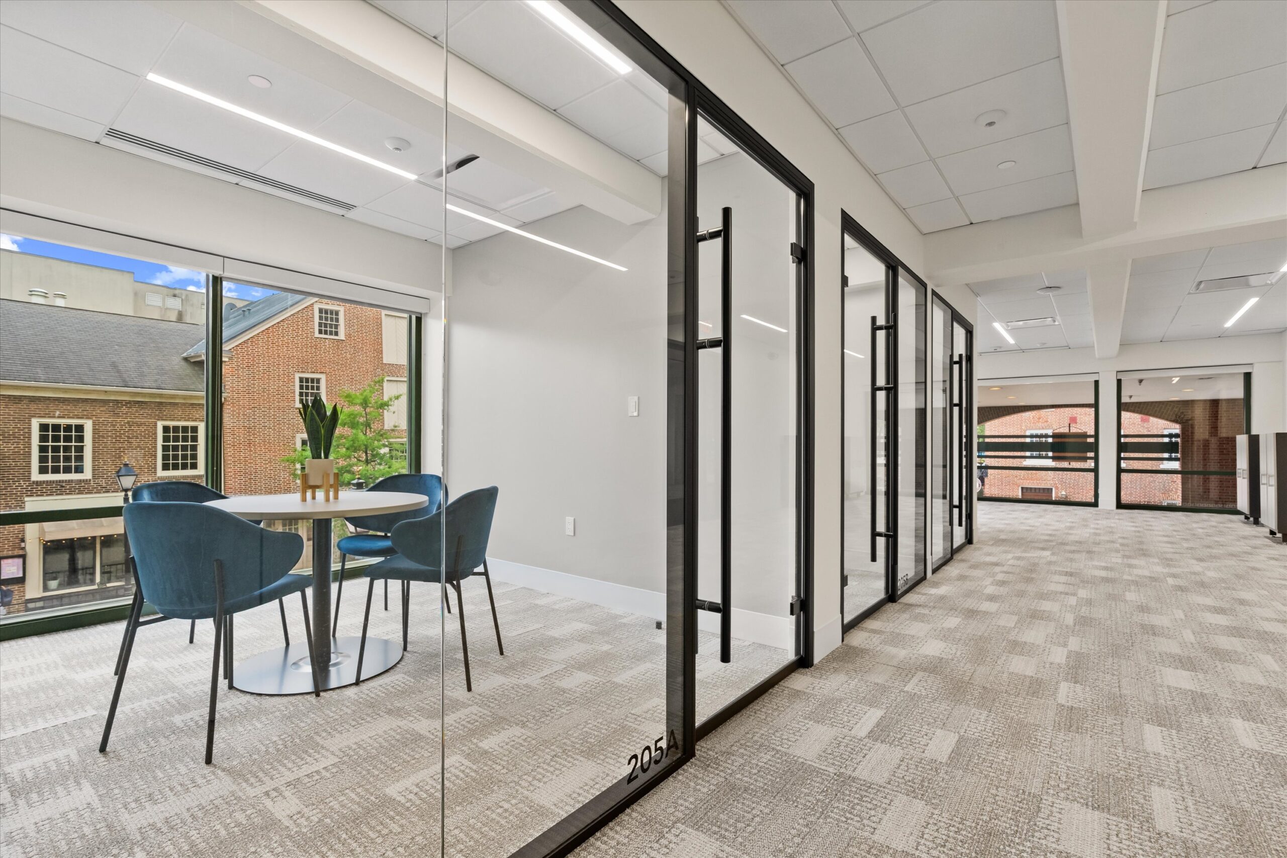 Located in a corner position away from main building traffic, this suite delivers quiet workspace. Nine workstations provide a foundation for focused work, while two windowed internal rooms offer flexibility for offices or meetings. Corner windows bring in natural light from multiple angles.