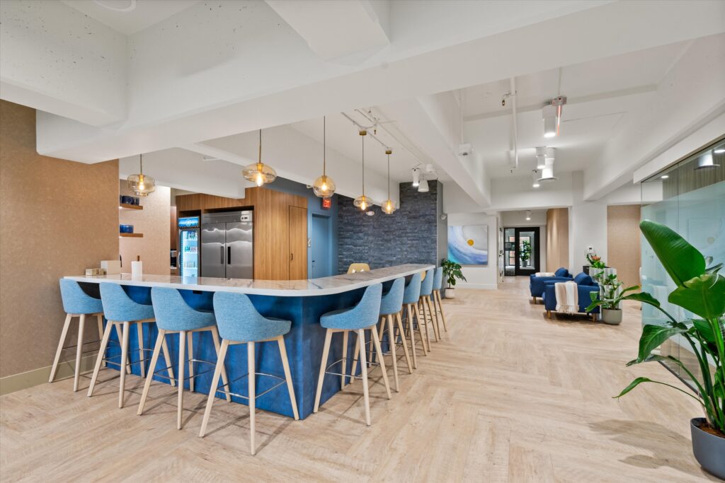 Positioned in a corner away from main traffic areas, this suite offers workspace with added privacy. Eleven workstations provide room to accommodate your team, while three internal offices adapt as meeting areas or individual offices based on your needs. Corner windows bring in natural light throughout the space.